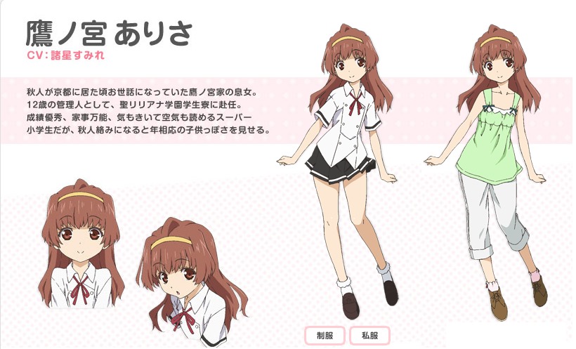 鷹乃宮亞里沙(CV:諸星 (諸星すみれ)) 第一話中沒有登場,是扶養秋人的鷹乃宮家的女兒。