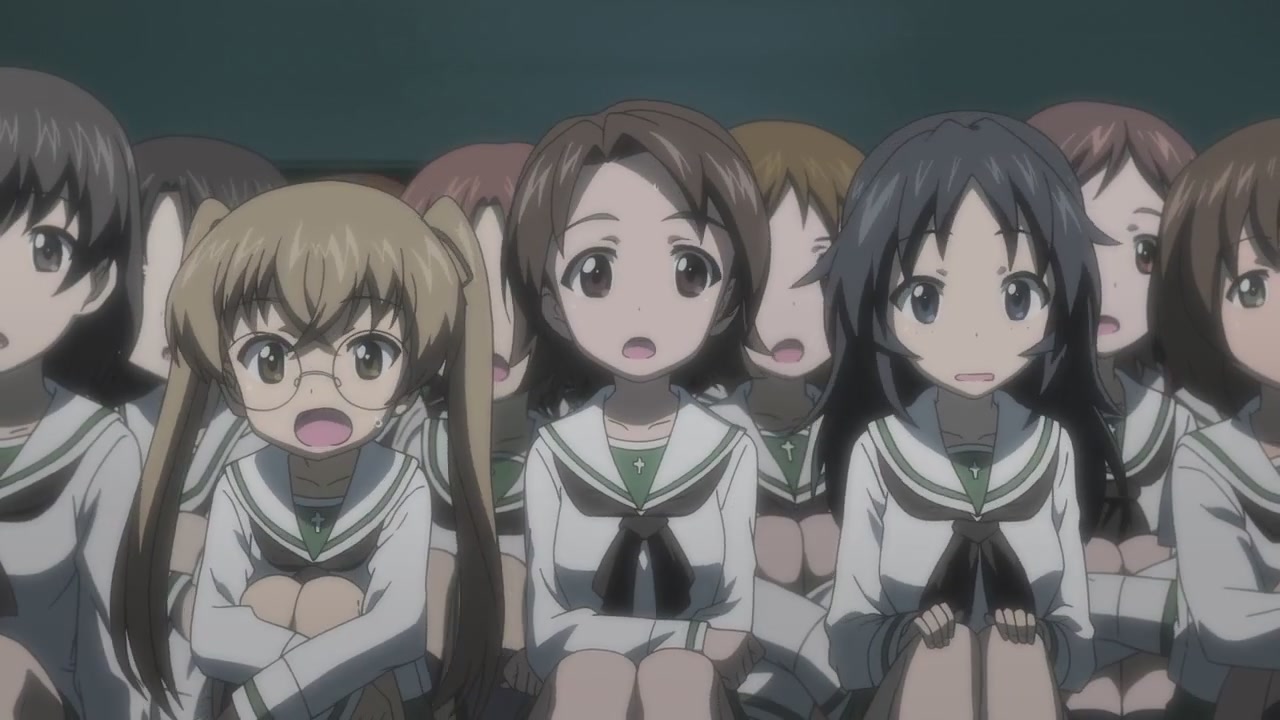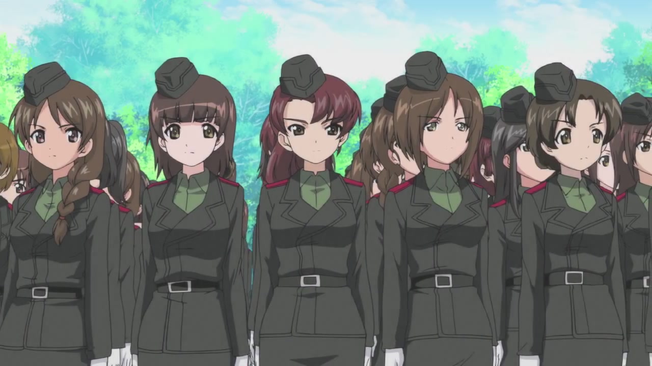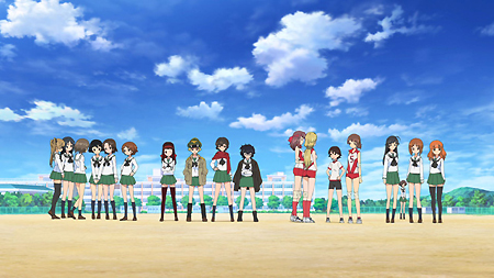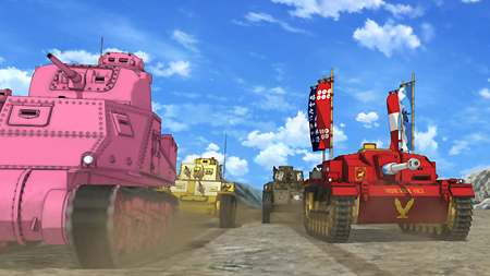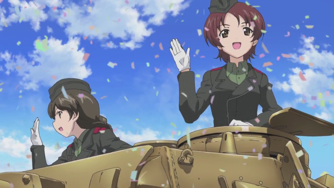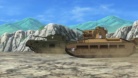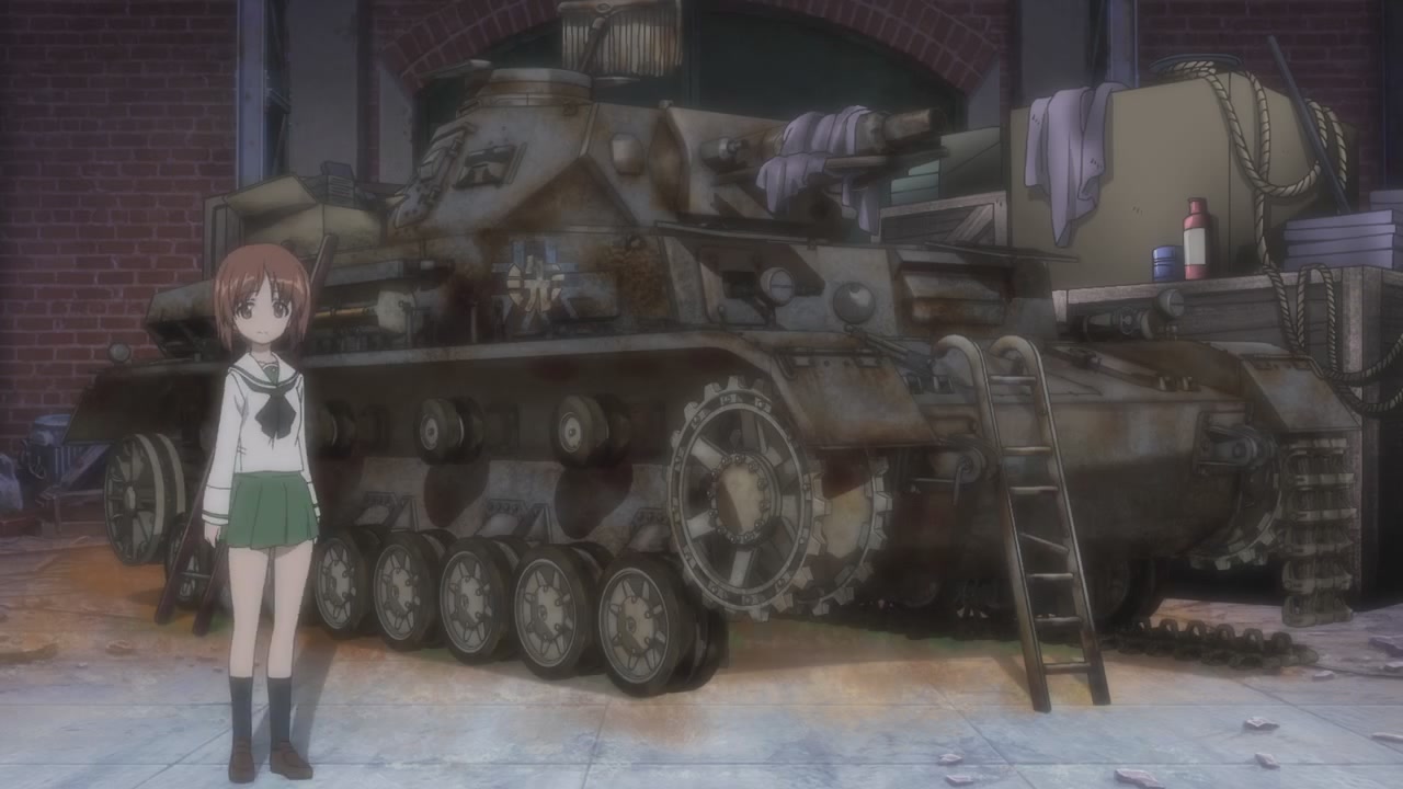 第一話一開始,就是西住美穗所在的戰車隊伍第一次的比賽。背景、戰車皆以 3D 的方式表現,因此畫面在運鏡上非常的自由,而且戰車的行進中的搖晃、配合引擎與履帶、還有炮台轉動的聲音,可說是臨場感十足。不過就像在先行上映活動中,中上育實與茅野愛衣兩位聲優所說,那個畫面真的會讓人有頭暈的感覺。從對戰中炮彈爆炸的情況來看,戰鬥使用的應該是實彈,可是參賽的成員卻連鋼盔都沒戴…這一點相當讓人疑惑,雖然照官方的介紹來看不太可能,但從畫面演出上看起來,這比賽如果被打中,很像真的會死人的樣子阿!