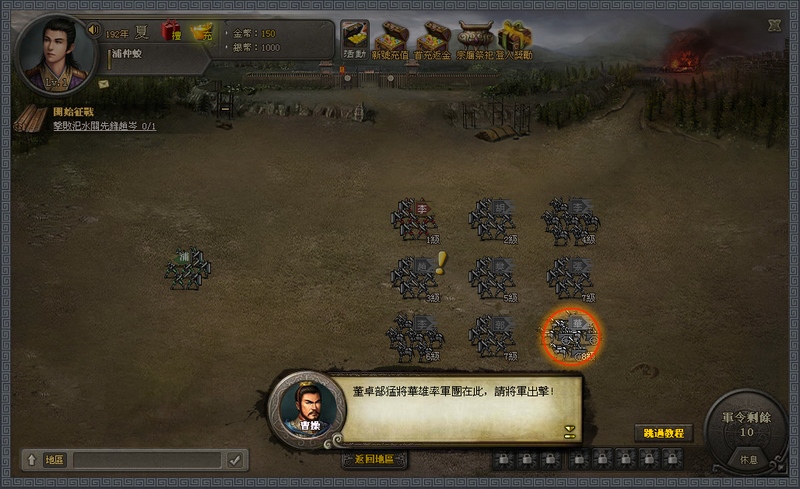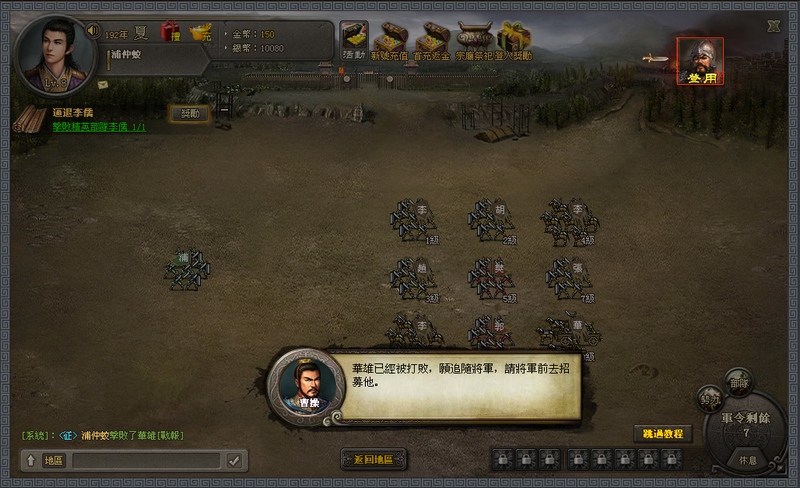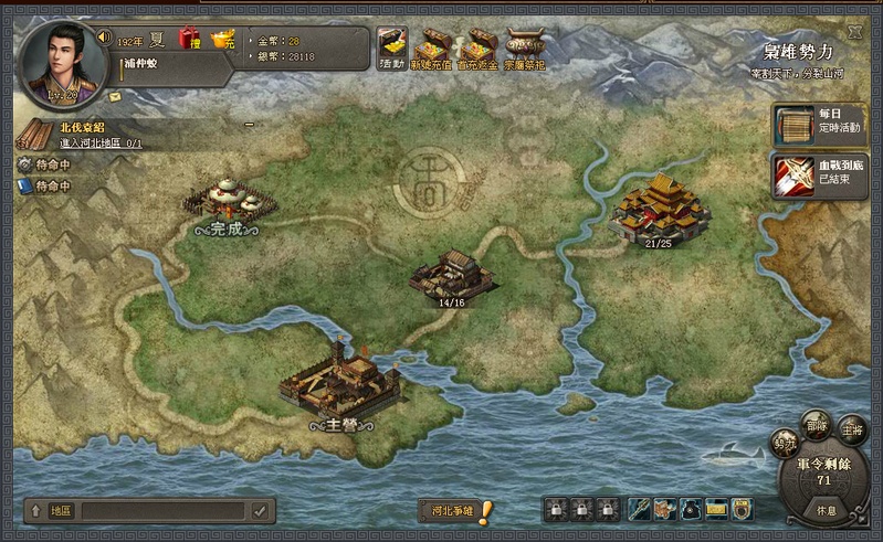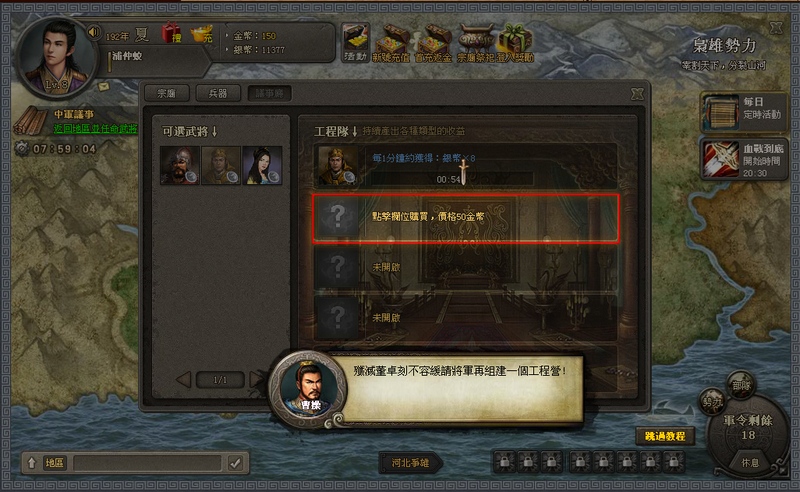 截至目前為止,玩家會一直不斷收到獎勵,對戰也會一直勝利,當完成所有的任務及收取所有的獎勵,系統會請你回到地區,這時地圖上會出現「主營」這個新功能,系統會請你先進「議事廳」,這裡是利用武將收集銀幣的場所。