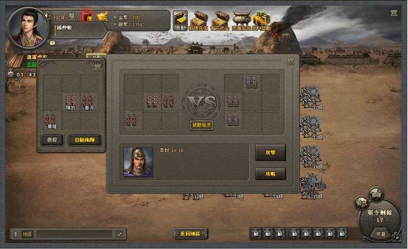 但是因為技能及兵器等級的提升會依據角色的等級而限制,若是都將等級升到頂,但是還是不能繼續打勝仗,可以考慮換一下陣型或是武將的排列組合,或者利用「攻略」或是「破敵秘笈」,參考一下過去成功玩家的佈陣法,嘗試再次闖關。
