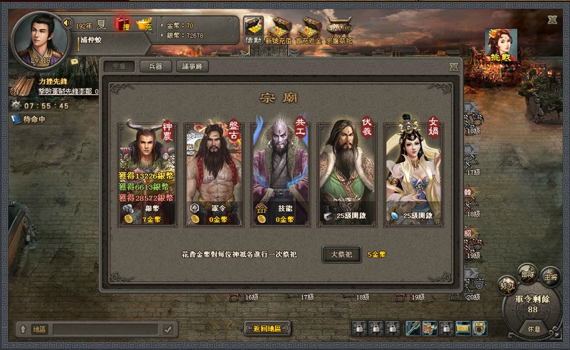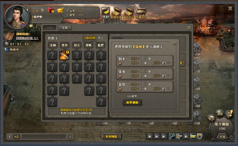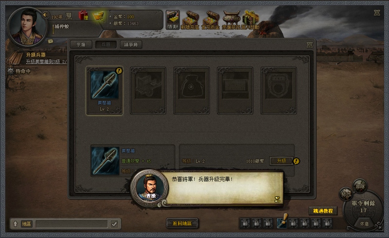 開始進入兵器的技能訓練之後,需要耗費一些時間來等待兵器培養的時間,如果要節省時間,可以花費金幣、銀幣或是軍令來加快速度,為了讓金幣、銀幣的損耗不要太快,就要不斷的進行祭祀、演武、接任務…來補充資源。