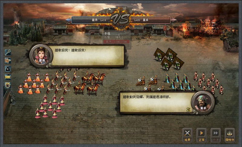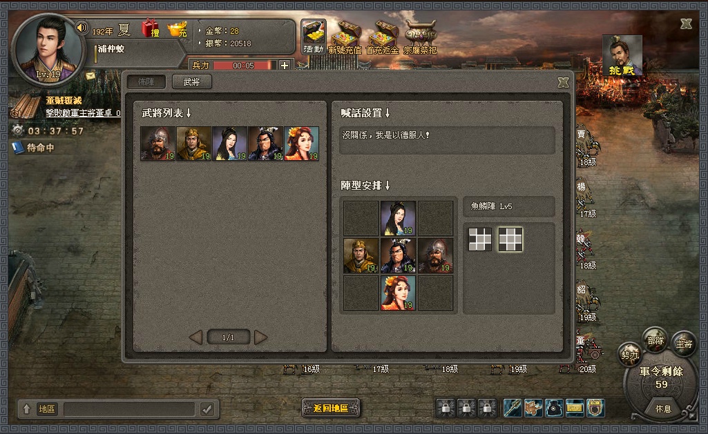 雖然在在 LV.19 有稍微卡等,但是按照著任務的進度推圖,將會依序取得完整的技能還有兵器,這張地圖最重要的新陣型「魚鱗陣」也出現了,得靠它擊敗董卓。
