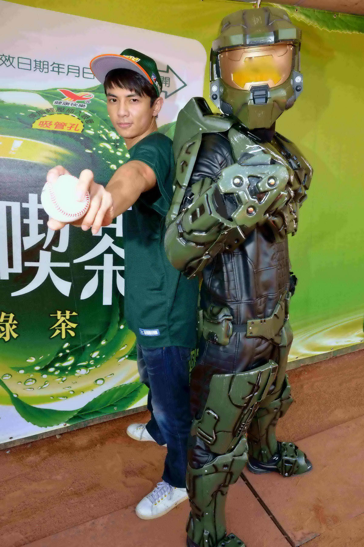 10 月 13 日傍晚時分,士官長正式踏上台南球場中央為中華職棒 23 年總冠軍賽首戰擔任開球嘉賓,身為英雄的士官長連拿起球棒也毫不遜色,揮棒姿勢都十分到位。