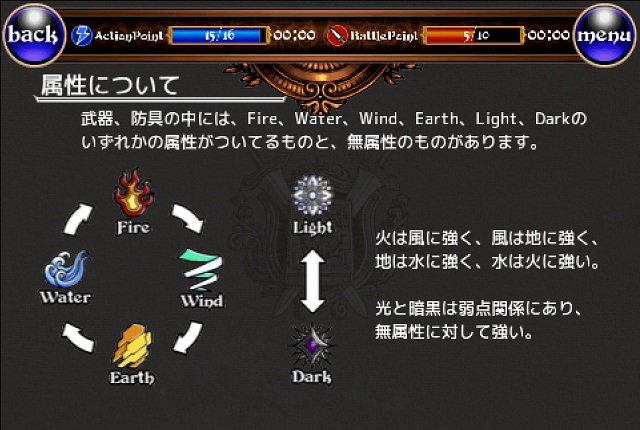 戰鬥的數據除了物理與魔法的差別外,還有光、闇、風、火、水、地共六種屬性相剋的元素,要在「闘技場」中無往不利,資深玩家會針對前幾名的玩家準備幾套專用裝備應付。
