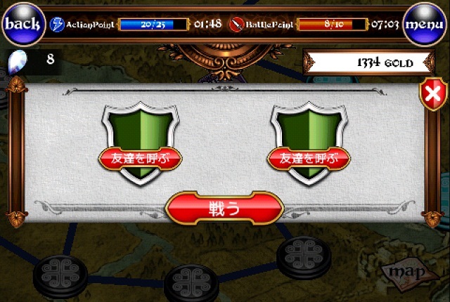典型的線上社群遊戲一定少不了兩個重要的參數「行動數點(Action Point)) 與「對戰點數(Battle Point)」,玩家在地圖上探索每一個關卡時必須消費「行動點數」,而參與一對一或三對三的「闘技場」時,必須消費「對戰點數」。