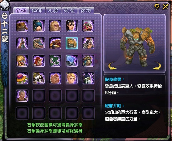 此外,為了增加遊戲的趣味性和社交性,七十二變變身卡片均為非綁定道具,玩家們可以自由交換分享;想知道目前卡片蒐集的狀況,玩家只需要打開七十二變功能介面,即可清楚看到變身列表。而遊戲中越稀有的變身技能將越難取得,因此想要擁有與眾不同的變身能力,玩家可得加把勁多多努力唷!