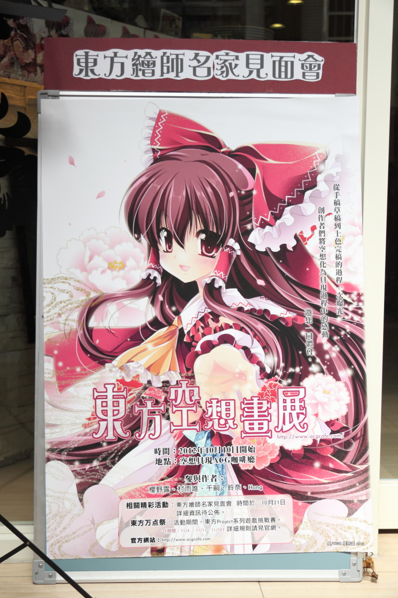 空想具現 ACG 咖啡廳於 10 月 10 日(三)至 11 月 18 日(日),舉辦為期 1 個月的「東方空想畫展」。店內展示了 Wish+希冀之翼+、黑白工房、Origin Zero- 和黑蛛白蛛等繪畫社團的作品。