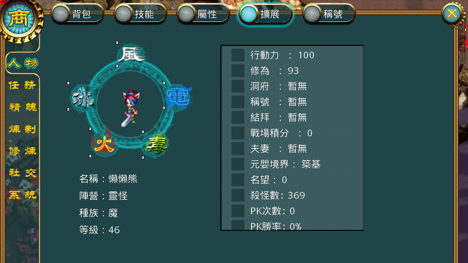 百變人物-玩家自由選擇氏人、玄仙、幻妖、靈怪四大種族,再輔以各式裝備,讓你走在路上絕不撞衫!而以特色來說,氏人與人類最為相近,心性質樸而腳踏實地。玄仙,顧名思義即為仙人的一種,靈性飄渺,能夠浮游在空中。幻妖,野性奔放的族群,雖然看似妖冶不羈,但其實尚存善心。靈怪,狀似曠野動物,或口鼻像貓熊、或長有尻尾,型貌介於人獸之間,個性孤高冷傲。