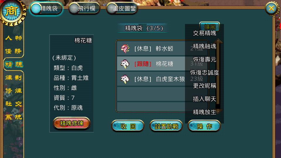 從任務或是打怪過程中獲得更多種類的精魄,訓練牠們,讓牠們成為旅途上的好伙伴