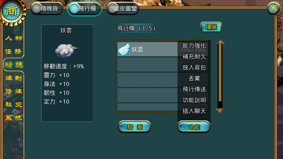 御劍飛行-還在地面上拖行腳步嗎?在明珠西遊裡,玩家可以駕御奇想天外的飛行道具:葫蘆、飛毯、判官筆、風火輪或是最最知名的筋斗雲,都有機會成為玩家的腳下坐騎!只要踏上專屬於你的飛行道具,哪怕是平時不能跨越的地區,都能輕鬆快速地到達。