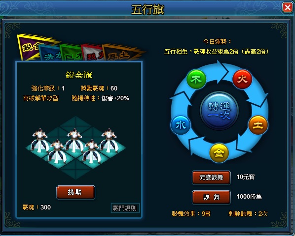 五行旗系統包括了烈火旗、厚土旗、洪水旗、銳金旗和巨木旗,各自擁有不同的特性,且不同組的教眾,會附帶額外的隨機屬性加成。在攻打明教五行旗教眾時,玩家必須靈活運用不同陣型及擅用「五行相生」的原理才能成功擊退。並獲得可讓角色實力更加卓越的戰魂點數!