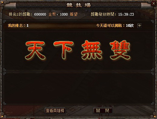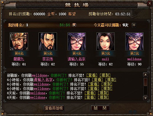 玩家每天都可以進入競技場挑戰伺服器中的強者,提升自己的排名,並得到大量的聲望及可觀的金錢。而競技場中臥虎藏龍,每個人擅用的陣法及配置的兵種都不同,若是想要一招半式打天下可是行不通的,要靈活運用手中兵種及陣法,才能百戰百勝。