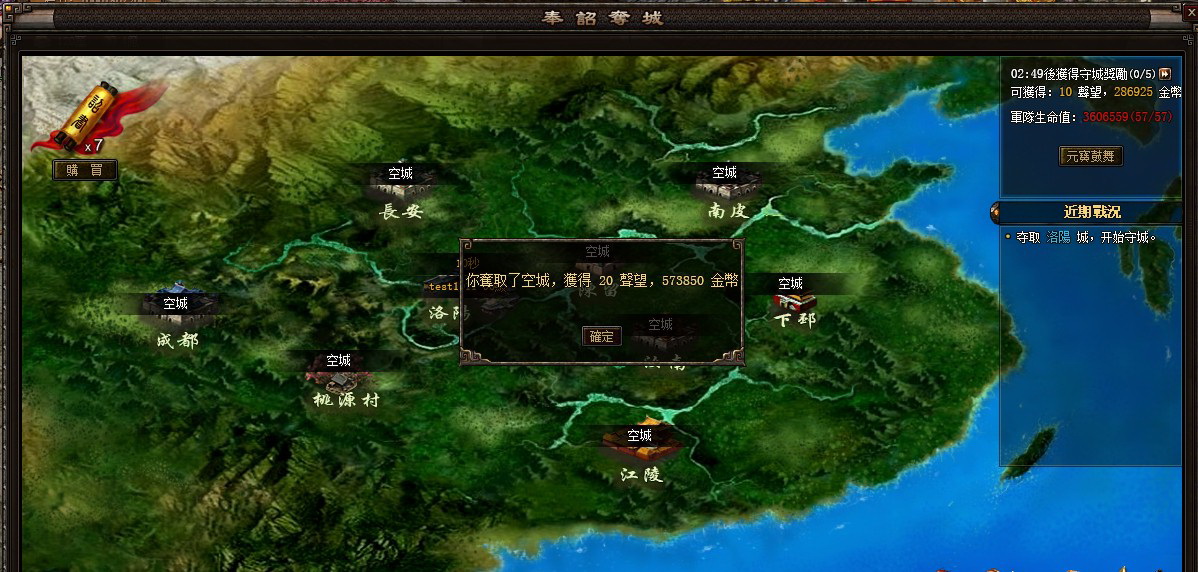 戰龍》中,當玩家達到一定的等級,便能開啟奉詔奪城,進行佔地為王的攻城戰。玩家每天能得到一定數量的詔書,有了詔書就可以隨意佔領城池一段時間,並獲得大量的金錢及聲望;而沒有搶佔到空城也不用擔心,玩家可以靠著自身的兵力和智謀與城主進行一場轟轟烈烈的攻城大戰。獲勝後不但能奪下城池,更有額外的大量獎勵,而若是守城方獲勝的話也能得到額外的獎勵。
