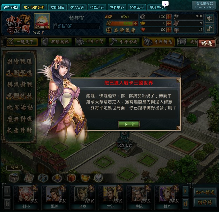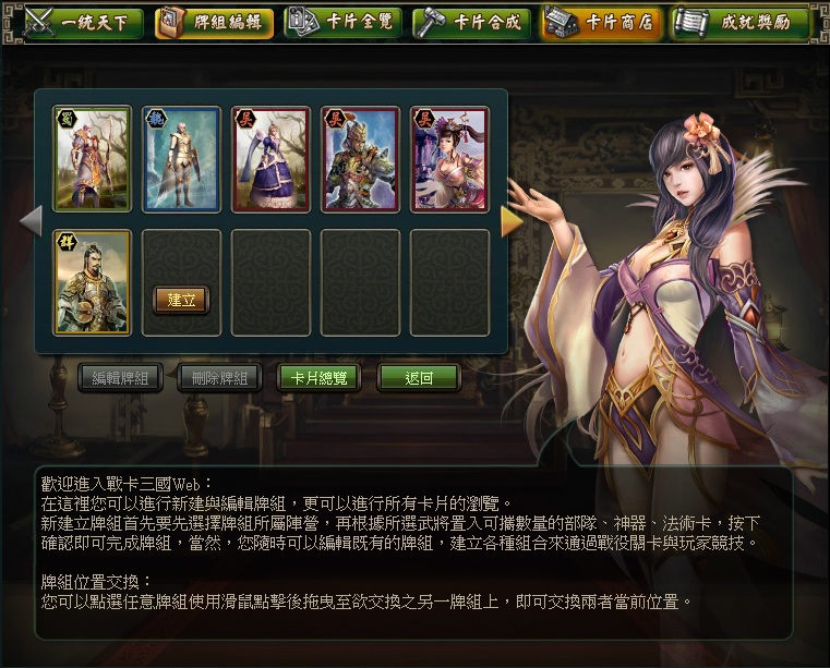宇峻奧汀研發自製的《戰卡三國 Web Card Game》融合了卡片以及經營遊戲玩法,遊戲已於 25 日正式展開不刪檔封測。官方表示,《戰卡三國 Web》不同於一般卡片對戰遊戲,採用了建設特殊建築,可以直接由建築中取得想要的類型卡片,再加上獨特的本命武將培養,大幅度的增加了策略性與可玩性,現在就帶領大家進入《戰卡三國 Web》戰鬥世界。