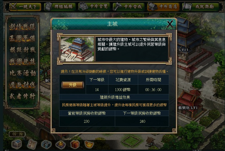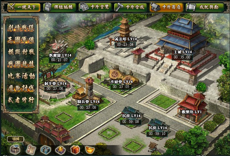除了劇情的推進之外,玩家可以經營自己的勢力,如同許多經營策略遊戲,玩家擁有自己的主城,當玩家的等級提升時,就可以建設相對應的建築物,在依據各建築物的等級,獲得相對應的卡片。