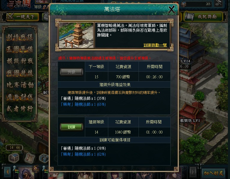 除此之外,玩家還有許多其他的系統可以遊玩,包括了王國軍備、模擬對戰、戰國競技、比賽活動、以及玩家等級 20 後才會出現的選項魔獸討伐。