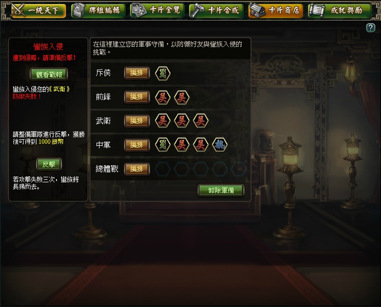 玩家每天可以攻打自己的朋友以取得獎勵,如果想防禦朋友的進攻,同時測試自己牌組的強度,可以在「王國軍備」當中設定。當玩家進攻時,可以選擇要使用幾組牌組進攻,當進攻時,就會將被進攻方設定的牌組拿出來防禦。此外,由於天下並不太平,每隔一段時間就會有蠻族進攻,此時就會以預先的部隊進行抵擋。無論抵擋是否成功,玩家都可以選擇是否追擊。如果打贏,還會有額外的收入。