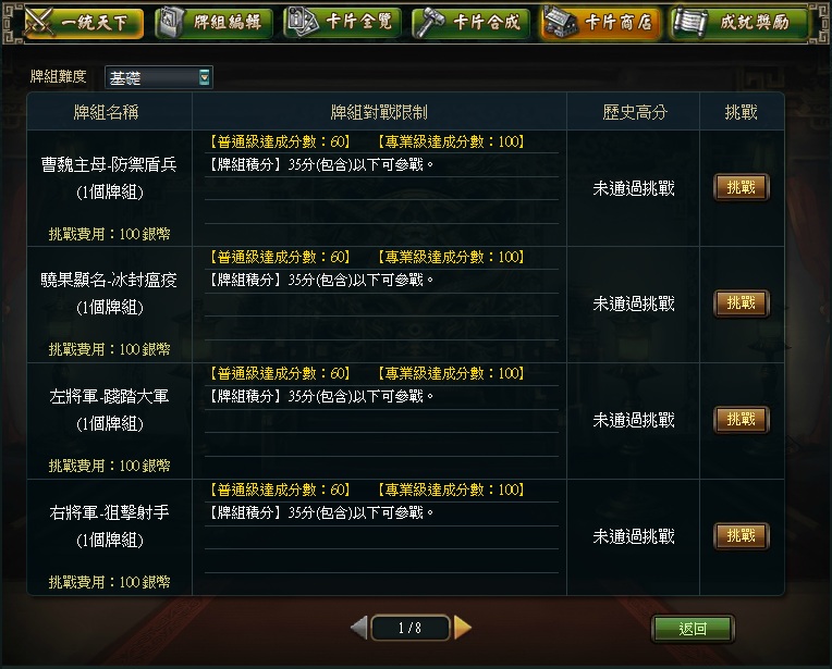 模擬對戰提供了兩項功能,一者是拿自己的牌組跟自己的牌組練習,可以讓玩家更容易的挑選你的牌組,畢竟各種異能、兵種相互剋制,多推演幾次總是沒錯。另一者則是由系統預先準備了許多牌組,提供玩家反覆的挑戰。在這裡,打贏電腦牌組之外,還會依據玩家使用回合、摧毀敵方卡片數量、本身存留卡片數量進行評分,可以鍛練玩家針對特定牌組進行練習挑戰。