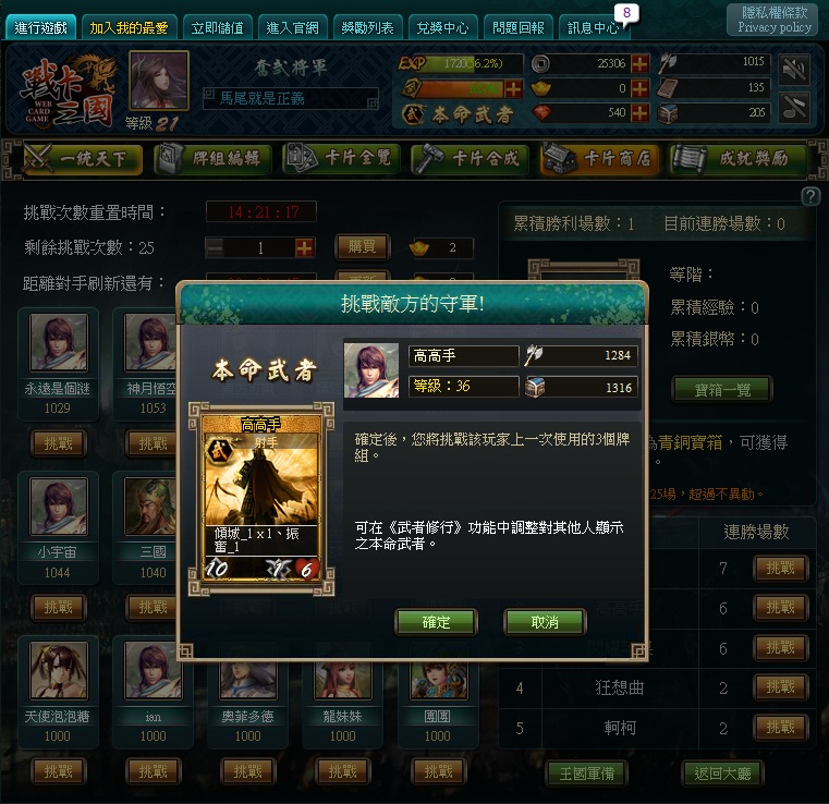 戰國競技業面,可以讓玩家挑戰競賽積分相近的玩家。敵對的牌組則是使用那位玩家最後一次進行競技時的牌組。競技積分是一個玩家之間誰強誰弱的一個參考數值。當你打贏玩家次數到一定數量時,還有寶箱可以領,連勝數量到達一定程度,或是中斷其他玩家的連勝次數,也會有系統公告。是玩家累積實力與名聲的好地方。