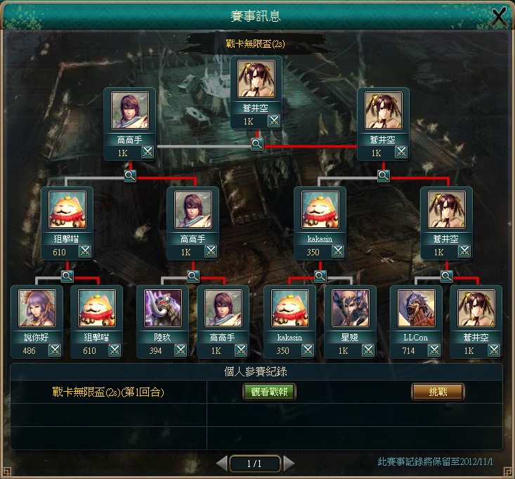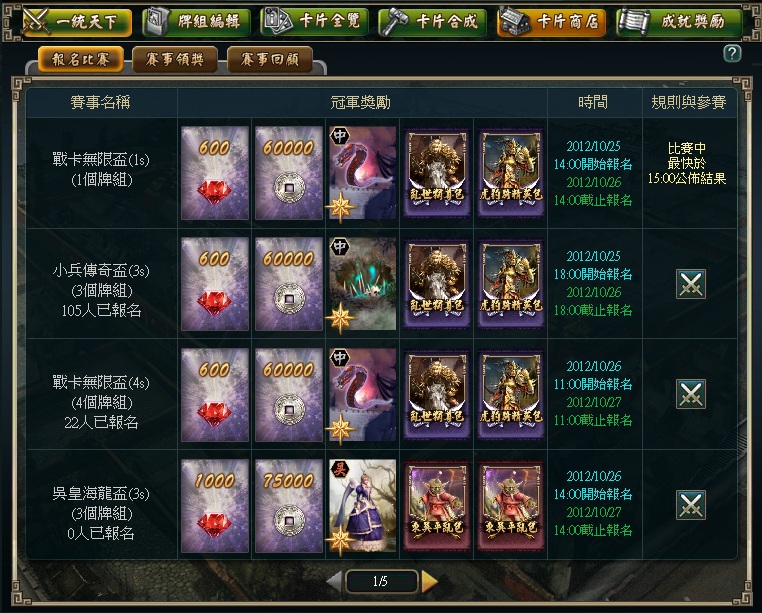 遊戲在固定時間會舉辦比賽,比賽有各種參賽條件,以及參賽需求門票。玩家可以根據自己的狀況來參加。在比賽完畢後除了自己參賽的戰報,遊戲還會列出前八強對戰的戰報可以讓玩家參考。而在八強對戰頁面中,還可以點選八強頭像旁的雙劍圖像,對該玩家當時使用的牌組進行挑戰。