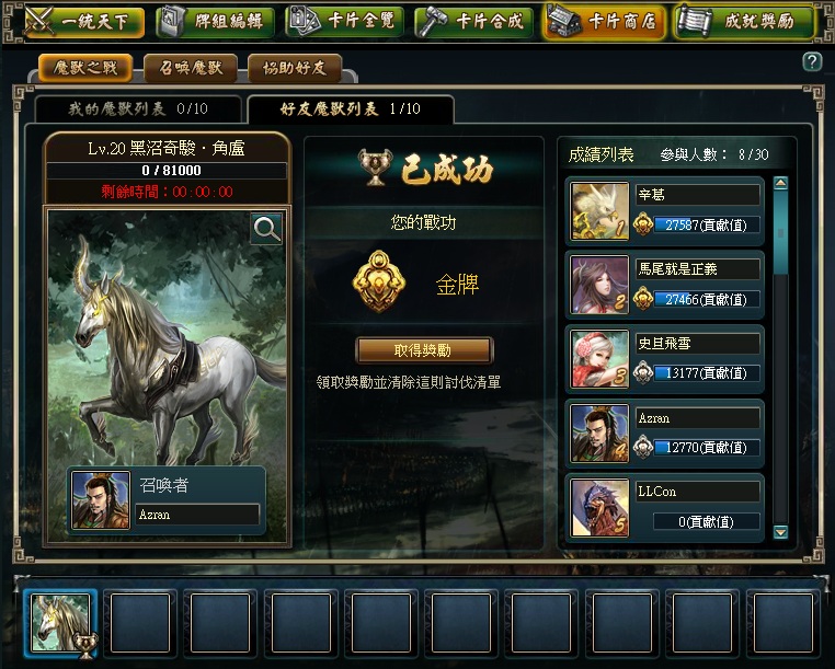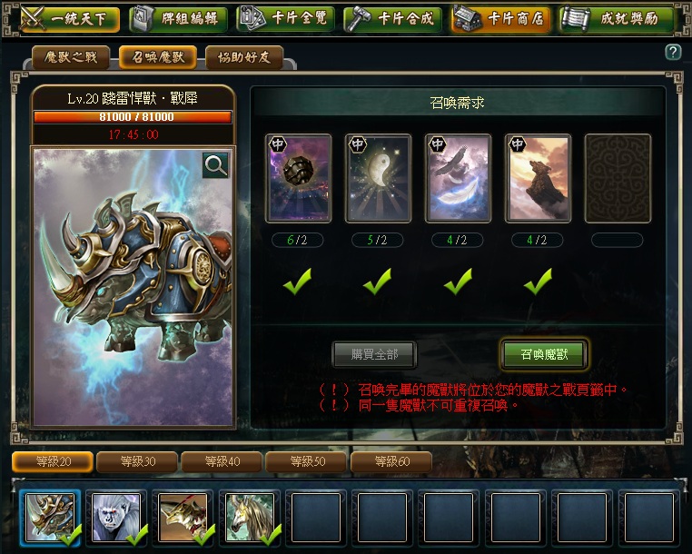 如果不喜歡跟人爭強鬥勝,或是手頭卡片不夠強大,魔獸討伐是另一個選擇。達到等級 20 後,玩家在戰役劇情過程中有機會獲得招喚魔獸的材料卡片,或是在遊戲中與好友互送禮物,召喚出魔獸後,再進行討伐。