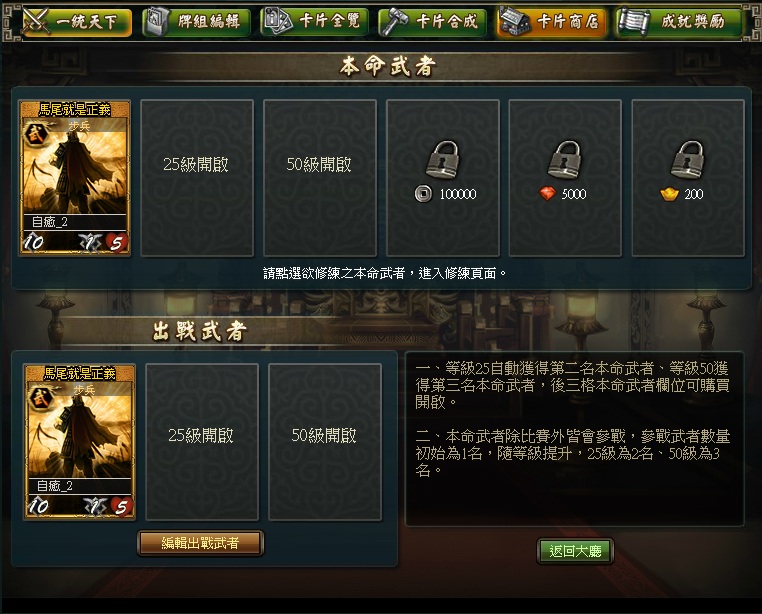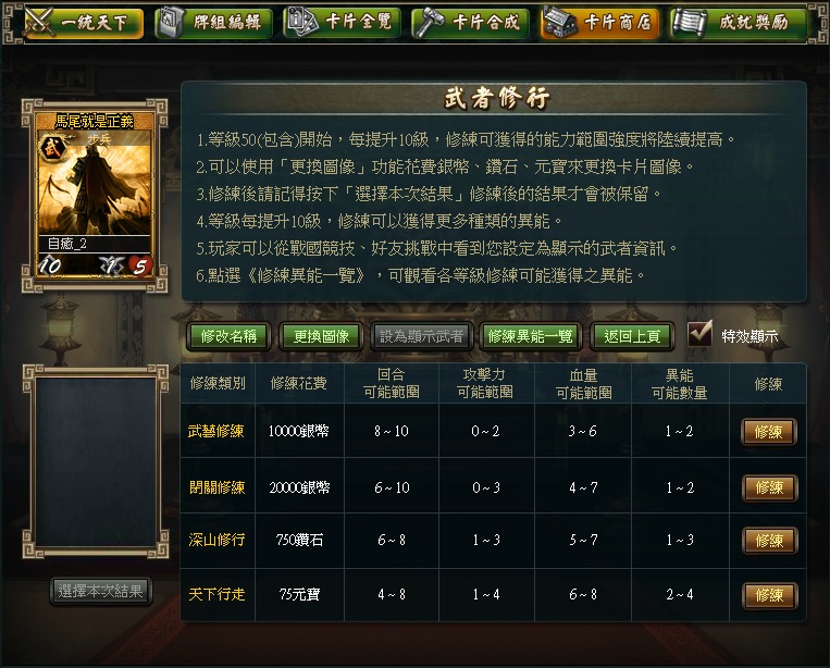 除了一般卡片之外,玩家分別會在 1 級、25 級以及 50 級時分別獲得一張本命武將卡片。本命武將卡片不需要額外安排,就會自動在戰鬥中隨機上場。玩家可以利用武將修鍊的系統來對本命武將卡片進行提升,只要付出一定的代價,就有機會將卡片修練到非常強大的地步。