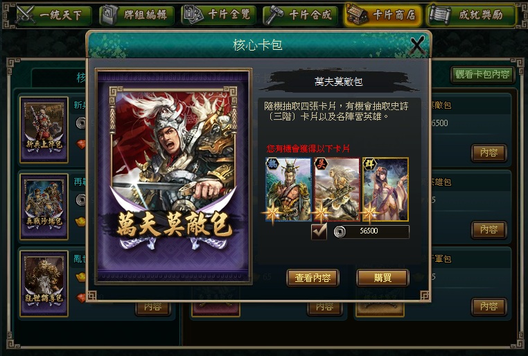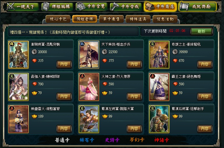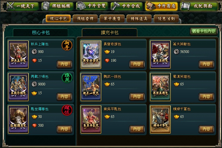 玩家要組牌組進行戰鬥,就需要有足夠的卡片。卡片的來源,除了每天跟好友之間互送特定卡片,經營領地獲得卡片之外,卡片商店就是最佳的選擇了。卡片商店分成幾種,隨機卡包、單卡、預組套牌。各有各自的價格。