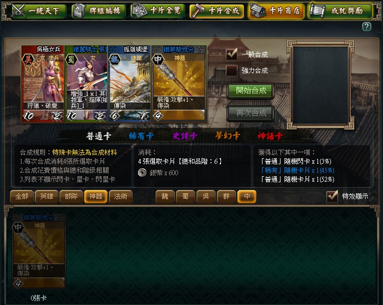 遊戲也提供了卡片合成,讓玩家可以花費銀幣,來將隨意四張卡片進行合成,如果運氣夠好,合出高級卡片也是件很爽快的事情。