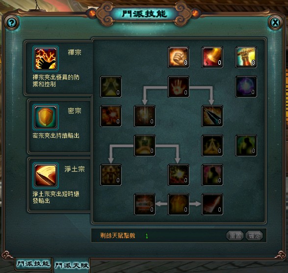 最重要的是門派會在 30 級時細分為三大系別,除了針對個別能力提升,同時會有專屬武功。以南少林為例: