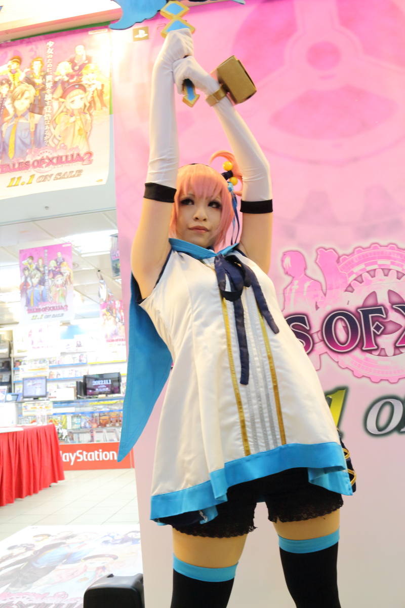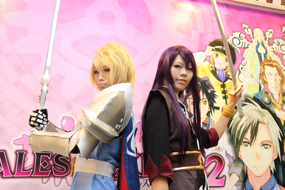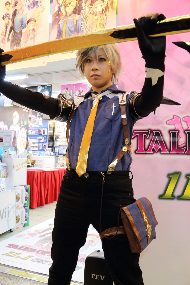 而在問答部分結束之後,先請製作人到一旁的評審席就座,舉辦了 Tales of Cosplay 大賽。現場總共報名了 8 組參賽者,由擔任評審的馬場英雄來選出前三名。而當主持人問到,對於 Cosplay 的評選標準為何時,製作人表示首先以角色服裝和道具製作的用心度、第二是看對於該角色的了解和神韻的掌握、最後是看是不是對於 Cosplay《