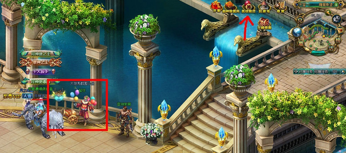 在地圖上只要看到圖片中下方的小丑 NPC,就可進入該活動嚕!或者點擊圖片右上方「氣球競技」功能按鈕,就能隨時隨地體驗射氣球的樂趣唷!