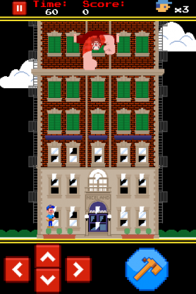 大金剛一樣到處搞破壞,而這個時候玩家就必須拿著鎚子攀爬上大樓,試著修補這些受損的地方以得到分數。
