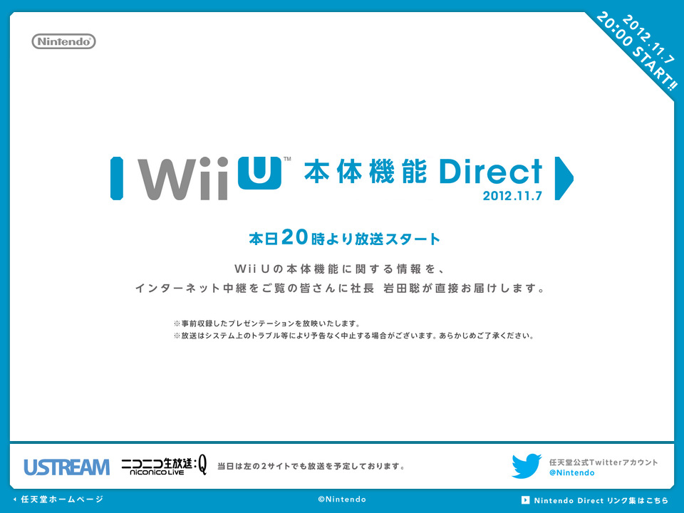 niconico 生放送舉辦 Wii U 系統功能相關資訊線上發表會「Nintendo Direct」,同樣由任天堂社長岩田聰親自主持,播映內容為事先在任天堂本社錄製好的發表會。