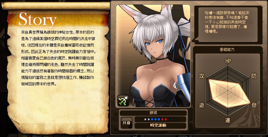 自稱時空調查員,有著銀狐綽號的異世界女性。究竟為什麼會突然在這個世界上出現,她自己也感到相當意外,不過光是苦惱原因並不能解決問題,因此現在正努力尋找適合材料進行時光機器的製作中。雖然製作時空機器離開這裡對她而言很重要,但是自從在這個世界中被喚醒後,她又覺得似乎發現了新的世界般快樂,所以去或者是留的兩種心情,正在她心中糾葛著。
