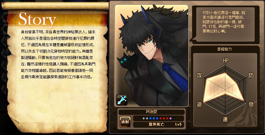 來自異世界的黑衣人,根據本人所說似乎是個在各時間中穿梭的罪犯,不過因為現在本體是魔械蛋吸收記憶形成,所以失去了切割次元穿梭時空的能力。興趣是製造騷動,只要有他在的地方就絕對有混亂存在,雖然這樣的性格令人頭痛,不過因為戰鬥能力相當卓越,因此能讓探索遺跡的工作事半功倍!