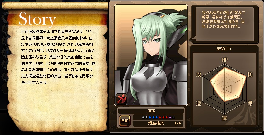 目前靈魂與魔械蛋相容性最高的冒險者,似乎是來自異世界的時空調查員專屬護衛機兵,由於本身就是注入靈魂的機械,所以與魔械蛋相容性高的原因,也應該就是這個緣故。在這個大陸上醒來後發現,某些奇怪的東西也隨之在這個世界上覺醒,且該物與自身有很大的關聯,雖然本身有護衛主人的使命,但在評估後還是決定先調查這些奇怪的東西,確認無恙後再想辦法回到主人身邊。