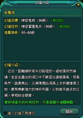 某日有位旅行者行經一山洞,忽聞其中有聲響,心生好奇便進洞一探。但直至夕陽西下,皆未見其身影。就在此時,陰風大作,只見旅行者失了魂似跌撞而出,嘴裡僅重覆一詞曰:修羅。此後世人便將此洞稱之為「修羅洞」。全新副本修羅洞等著玩家的挑戰,在這暗無天日的山洞中,究竟是隱藏著妖魔鬼怪,還是暗藏著世外高人?旅行者口中的修羅又為何物?一切的謎題等著玩家去一探究竟!
