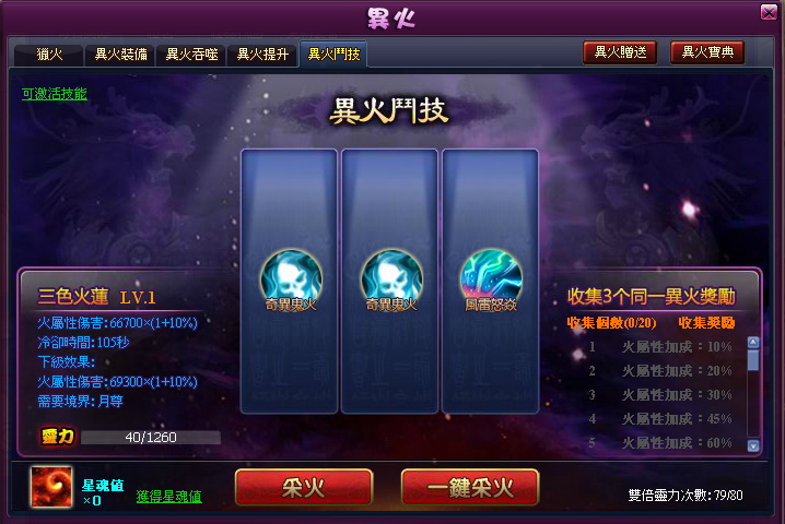 此次改版就能讓玩家親身體驗三色火蓮的強大,全新的三色火蓮系統只有達到月尊境界才能開啟,開啟後將會給予玩家攻擊時附加獨立於各屬性之外的火屬性傷害,此傷害不受任何防禦屬性減免,可說是最強的攻擊。而玩家可以在系統中收集並組合不同的異火,來強化此技能的傷害加成、冷卻時間等屬性,來幫助自己在戰鬥中有更大的優勢。