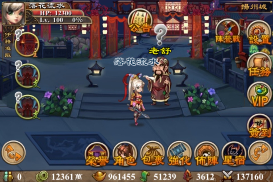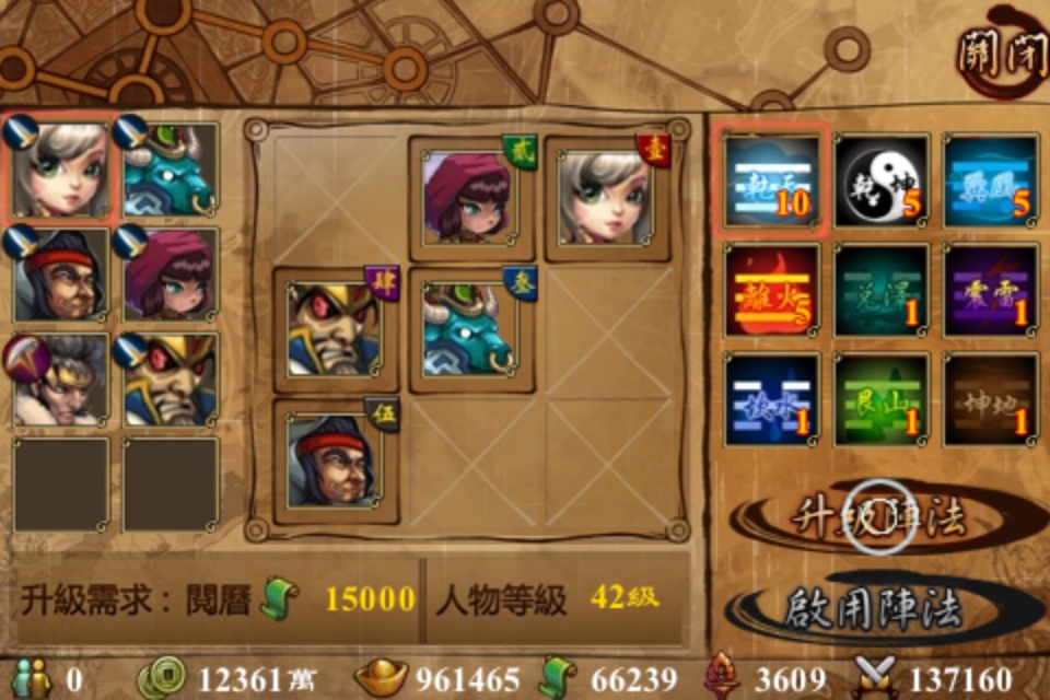 遊戲擁有完整的等級系統,需要一提的是遊戲的組隊系統,組隊需要講究陣法,陣法的升級也是克敵的關鍵。