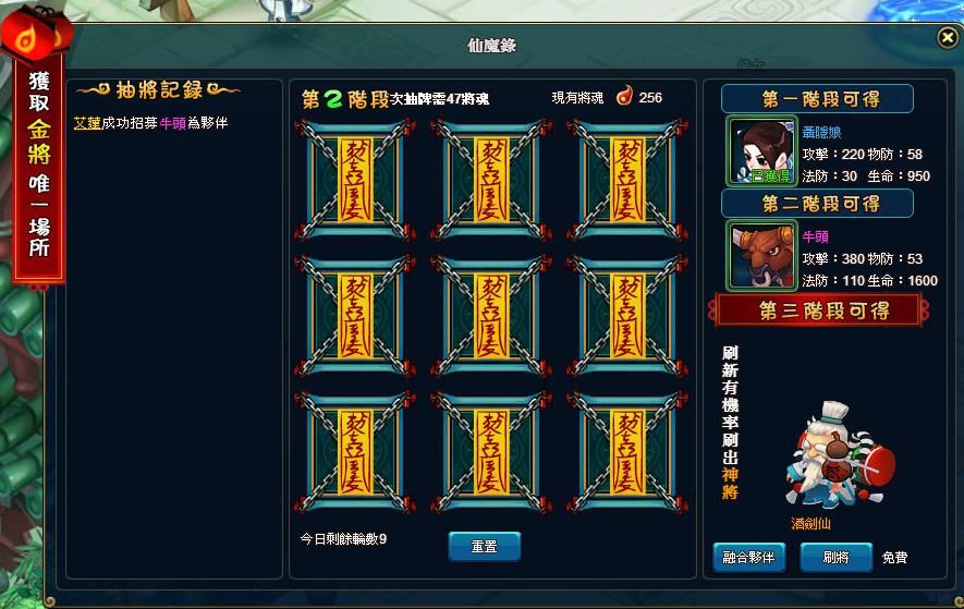 仙魔錄系統,可以讓玩家獲得品質更好的將領夥伴,藉由類似「翻牌」的小遊戲,來抽將領,每次抽將需要消耗一定量的