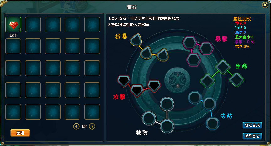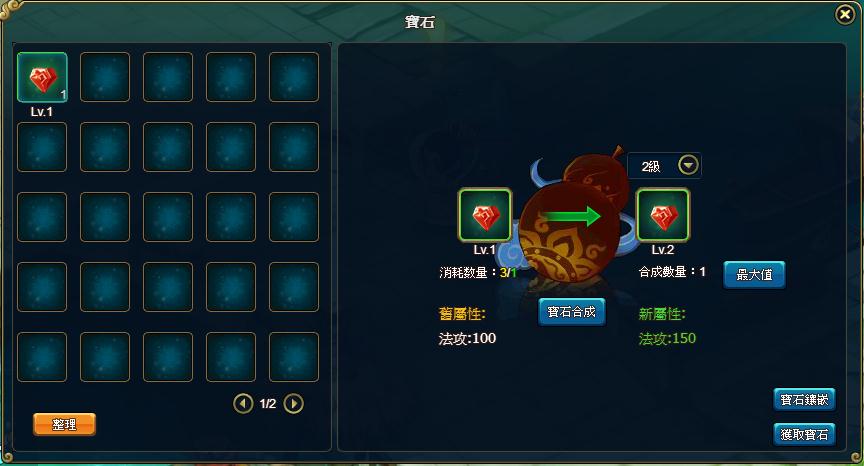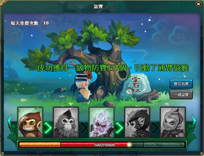 寶石系統,需透過「寶石林」場景來雇用猿猴來盜取寶石,獲得的寶石可以裝備在寶石槽內,來強化提升全體隊伍的能力數值,相同屬性的寶石還可以透過【寶石合成】來進一步的提升寶石的能力,使隊伍可以越來越強大喔!