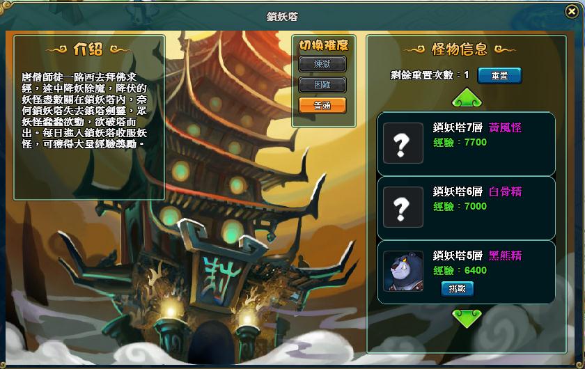 首先先來介紹鎖妖塔;鎖妖塔,乃是鎮鎖魔物的寶塔,共區分為【普通】、【困難】、【煉獄】等三座塔,需要逐一擊破才能前往下一座塔,而每座塔共有三十層樓,需要一層層擊敗在每層鎮守的魔物才擁有往上一層前進的資格喔!