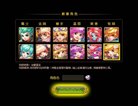 登入遊戲後,首先選擇性別及職業來創造角色,共有六大職業,分別為:戰士、法師、槍手、巫師、刺客、牧師。