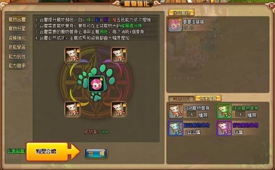寵物可透過合體,提升寵物的品質,依序為:白、綠、藍、紫、橙。合體成功後,寵物的成長與資質都會大幅的增加。