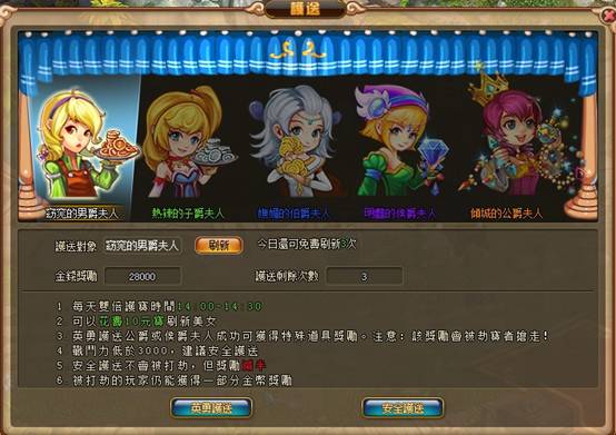 『護花運寶』是可以快速賺進金幣的活動。活動中共有五位美麗的夫人需要玩家護送,護送的夫人爵位越高階,玩家可獲得的報酬也越多,還有機會獲得夫人們提供的特殊道具獎勵。如果玩家在每日下午14:00 ~ 14:30,護送夫人就可獲得雙倍獎勵,想輕鬆賺金幣的玩家,這是千萬不能錯過的