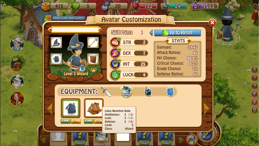 而在玩家升級時,將能夠獲得屬性點數,玩家可自由分配在力量、敏捷、智慧、幸運這四個屬性上,其中力量關係到近戰攻擊、敏捷高比較不容易在攻擊時失手、智慧與法術的強度有關、而幸運越高則越容易爆擊。