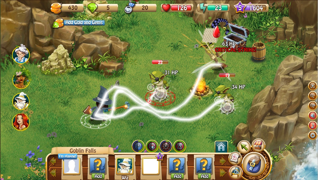 戰鬥的流程十分簡單,只要點擊怪物便會自動進行攻擊。隨著玩家等級提高,將能夠學到許多技能,其中也不乏像是「連鎖閃電」這般華麗又強大的範圍技喔!不過在戰鬥的時候也需要注意 HP,若是 HP 歸零的話,就必須回城「靜養」了。