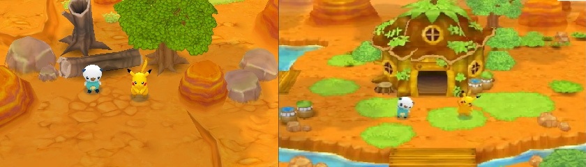 本作畫面大幅度革新,3D 化的神奇寶貝造型做得十分細膩,平時在街上亂跑時看著皮卡丘匆匆忙忙地追上來,感覺很可愛;而巨大神獸的氣勢遠勝以往,這點也令人驚豔。迷宮的背景物件細膩,開啟裸視 3D 功能可以深刻感受到地形起伏的立體感,而且不會有突兀的感覺。