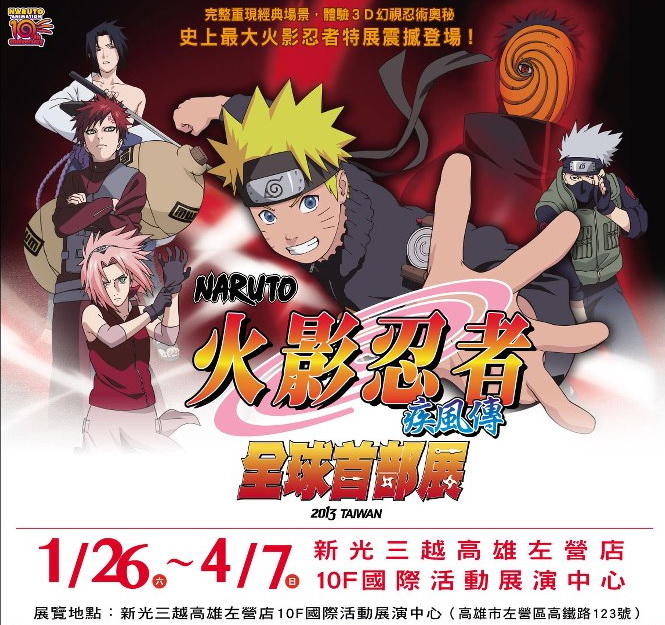 「火影忍者疾風傳全球首部展」將自明(2013)年 1 月 26 日(六)至 4 月 7 日(日)於高雄新光三越左營店 10F 國際活動展演中心登場( 2 月 9 日除夕休展一天),有興趣的人可前往相關網站查詢更多關於票價等詳細資訊。