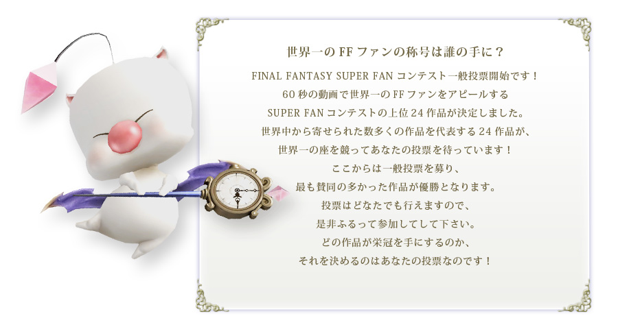 「Final Fantasy 超級粉絲比賽」是投稿 60 秒影片來比賽看誰是世界第一 FF 粉絲的活動,現已選出 24 件表現優異的投稿作品,11 月 26 日至 12 月 7 日開放網路投票,選出大家公認的世界第一 FF 粉絲。